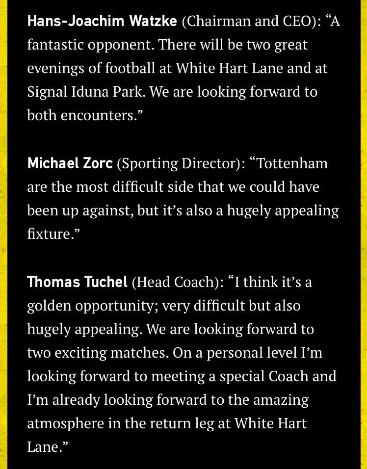 We have no concept (and neither do the footballing Gods) of Spurs doing things the easy way so why not face the Germans now as we'll have to face them at some point if we plan to keep on fancying our chances in this competition. The second leg at home is a lovely little bonus if we get a result in the Westfalenstadion, yellow wall and all.