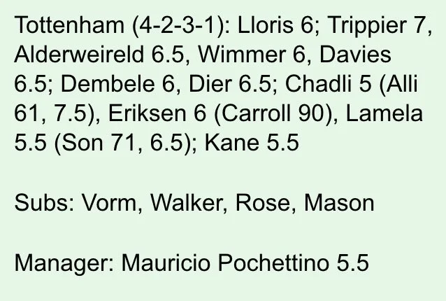 Ben Davies got into excellent positions inside the penalty area three times. The tempo simply went up a notch or two after the break and we flew at 'em. Davies and Kieran Trippier sprouting wings, bombing down the flanks like men possessed. We dominated through-out but Watford remained drilled and resilient. They also had Heurelho Gomes to thank for some key saves.